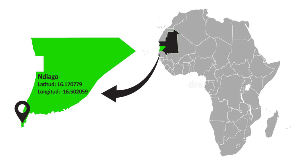 La comunidad de N’diago se encuentra en el departamento de Keur Massene, en la región de Trarza, al sudoeste de Mauritania. Se trata de una zona costera del Atlántico, inmersa en el delta del río Senegal. Parte del territorio se encuentra en tierra firme pero también encontramos multitud de islas, algunas de ellas habitadas. El pueblo más grande de la zona lleva el mismo nombre, N’diago, que es el lugar donde instauramos nuestra base de trabajo y operaciones.